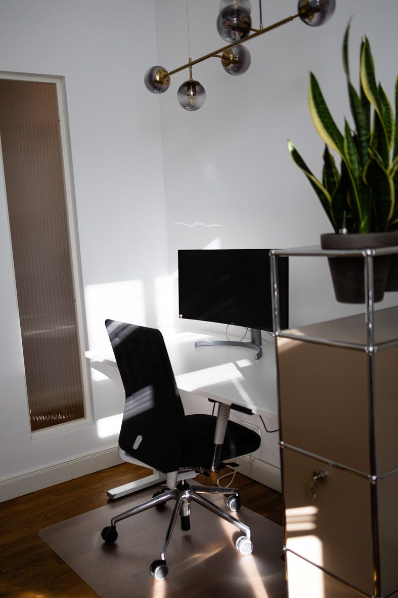 Moderner Arbeitsplatz mit einem 38 Zoll großen Curved Monitor, Lenovo-Laptop, Logitech Tastatur und Maus (auf Wunsch auch ergonomisch), gemütlicher Bürostuhl, DATEV-Mehrwertpaket, Dokument-Management-System, Online-Literatur (NWB, Beck, Haufe, etc.)